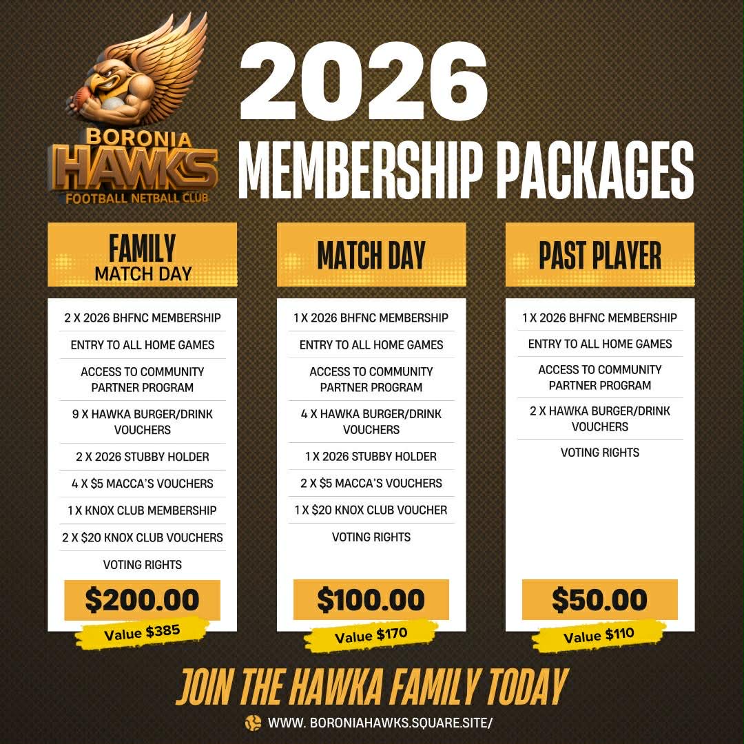Back the Hawks this season! There’s never been a better time to get behind the Boronia Hawks. With 3 types of memberships to choose from, this is your chance to show your support and be part of something special.