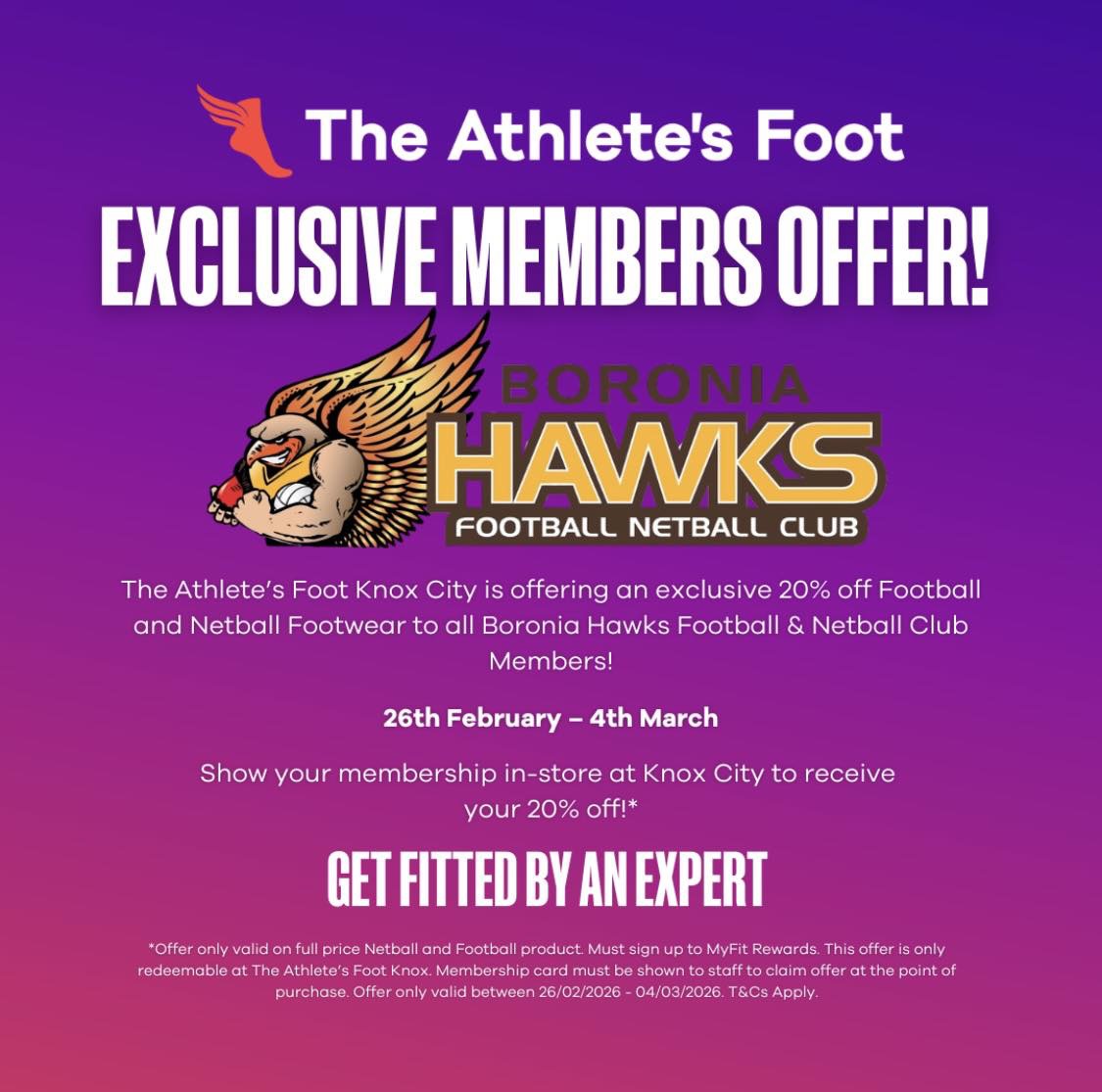 To celebrate, The Athletes Foot is offering 20% OFF all football and netball footwear exclusively for Boronia Hawks members beginning 6th February – 4th March, in-store at The Athletes Foot Knox. 10% off for the remainder of 2026.