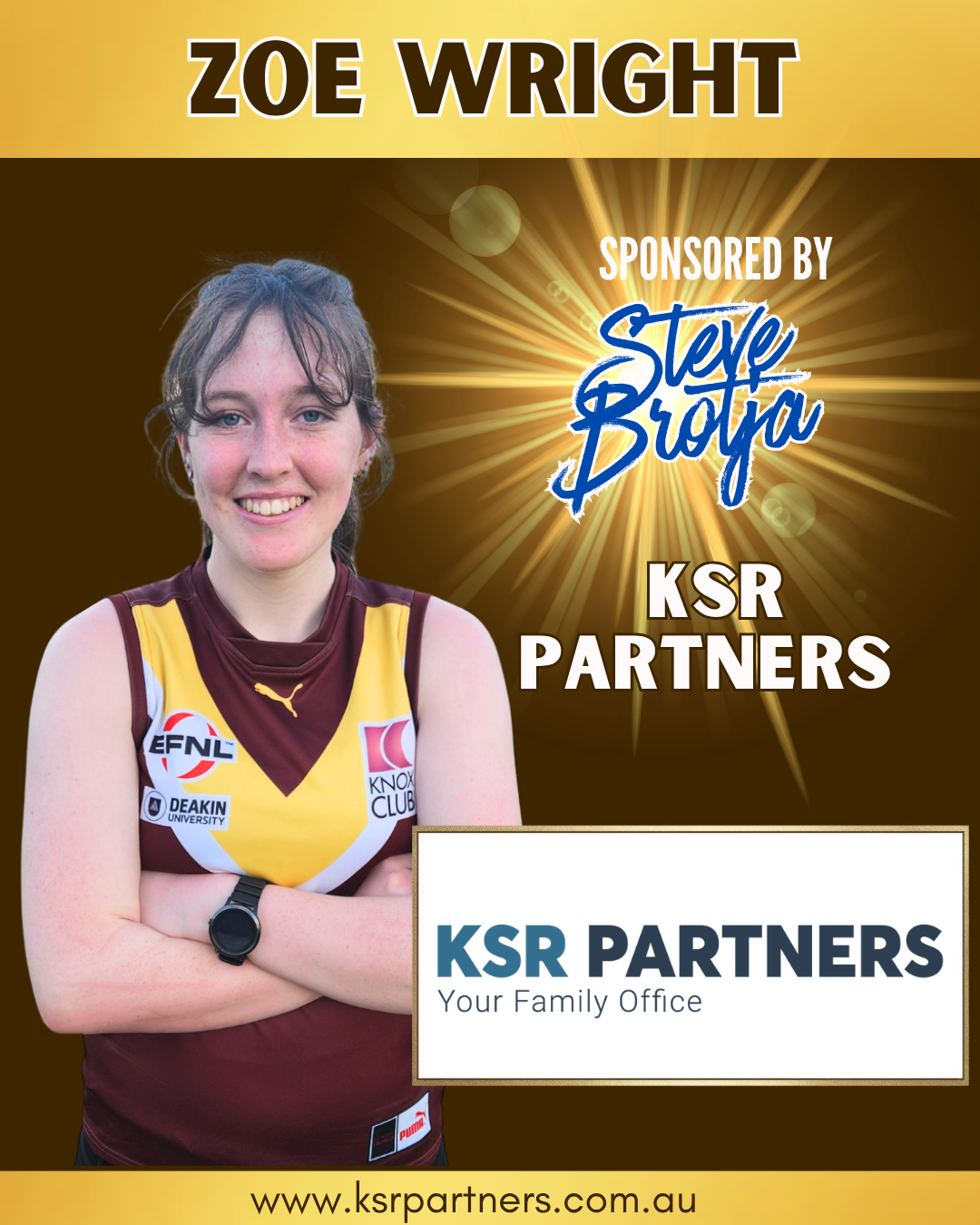 We are thrilled to welcome Zoe Wright to the Hawks! Zoe is an exciting young recruit who we think will have an immediate impact on the field this season. In even more fantastic news, Zoe is being supported by a dual-threat partnership: new Assistant Women’s Coach Steve Brotja and the team at KSR Partners!