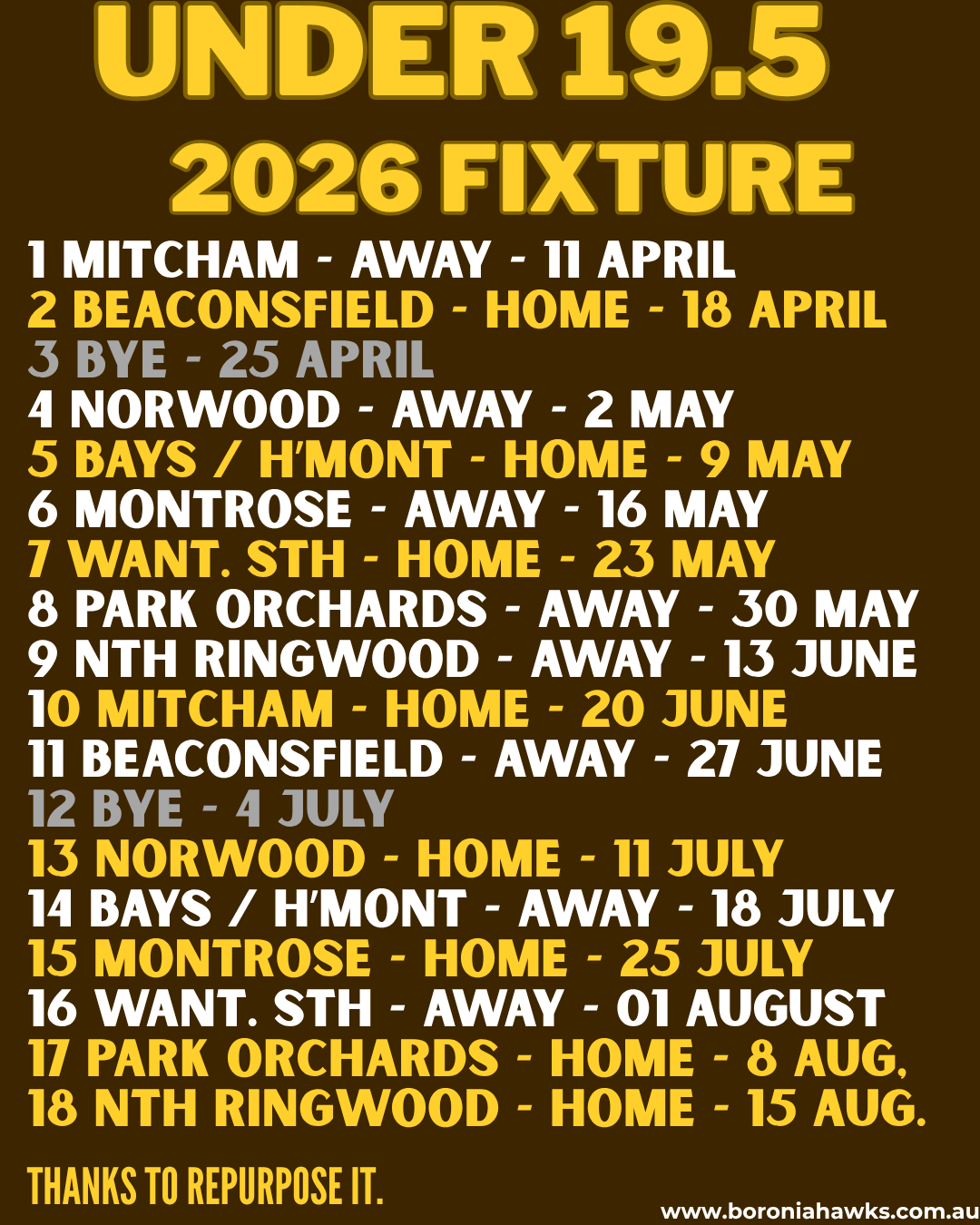 The EFNL has released the 2026 Fixture for Division 1 Under 19.5’s. There are 9 teams, with no Mooroolbark, so we have a bye in Rounds 3 and 12. We can’t wait for the start of a very exciting season for the boys!